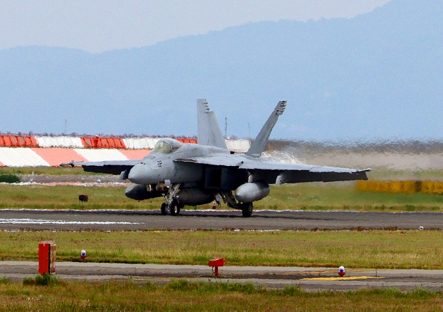 米海軍艦載機 F/A-18E スーパーホーネット 戦闘攻撃機(岩国基地)、NF、212番機が着陸 |