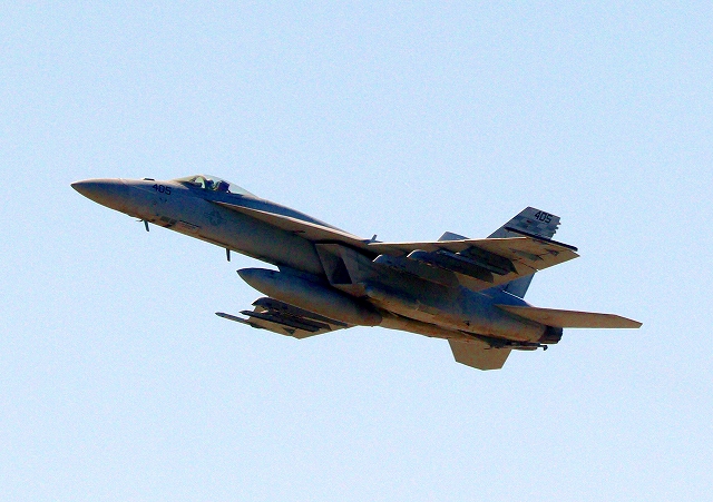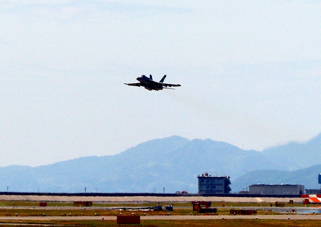 米海軍艦載機 F/A-18E スーパーホーネット 戦闘攻撃機(岩国基地)、NF、405番機が、硫黄島、FCLPに向けて?離陸 |