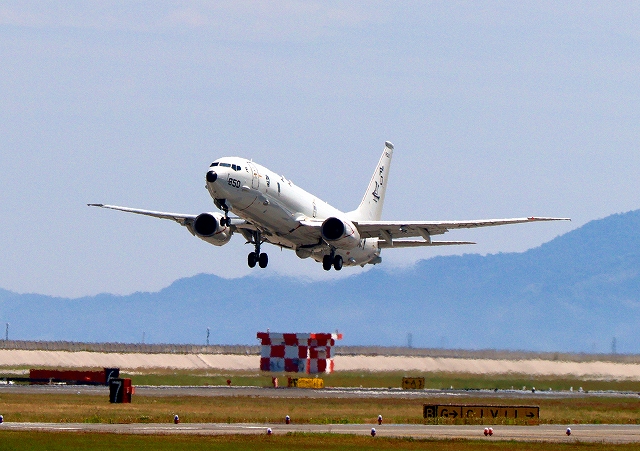 米海軍 P-8A 海上哨戒機 ポセイドン(嘉手納基地、三沢基地)、PD、850番機がタッチアンド・ゴーして旋回 |