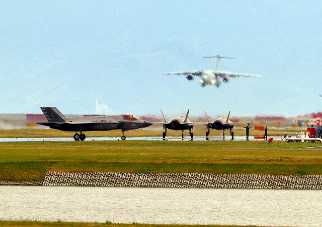 米海兵隊 F-35B ライトニングⅡ ステルス戦闘機(岩国基地)、VK、01番機、11番機、CF、09番機の上から、航空自衛隊 C-2 輸送機(美保基地)、38-1217番機が降りてきました。