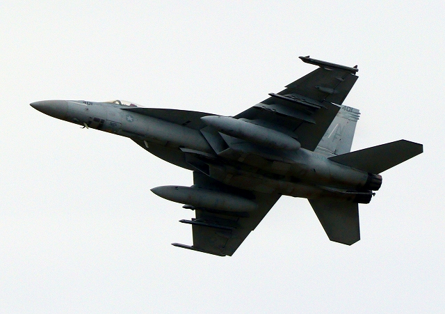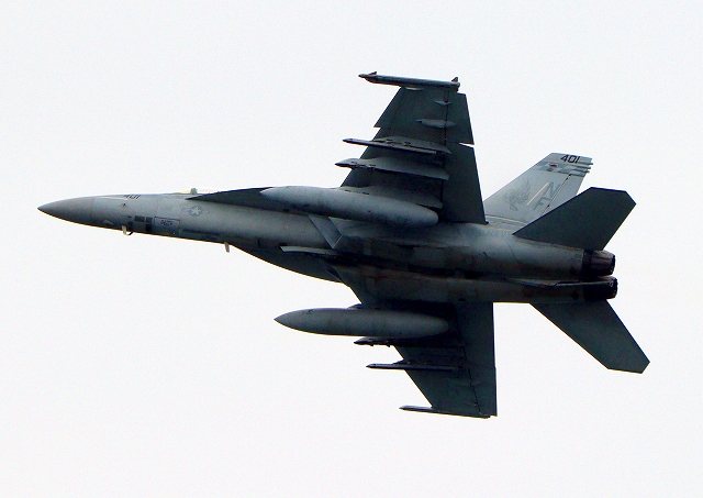 米海軍艦載機 F/A-18E スーパーホーネット 戦闘攻撃機(岩国基地)、NF、401番機が離陸 |