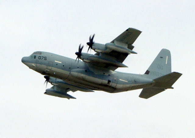 米海兵隊 KC-130J 空中給油機 スーパーハーキュリーズ(岩国基地)、QD 8075番機が離陸 |