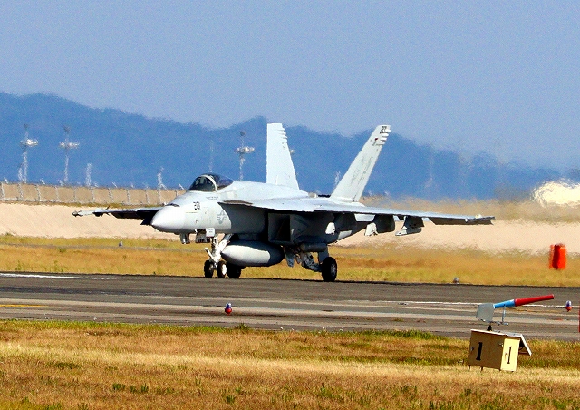 米海軍艦載機 F/A-18E スーパーホーネット 戦闘攻撃機(岩国基地)、NF、201番機が着陸 14時01分に離陸した機。1時間42分の飛行でした。 |