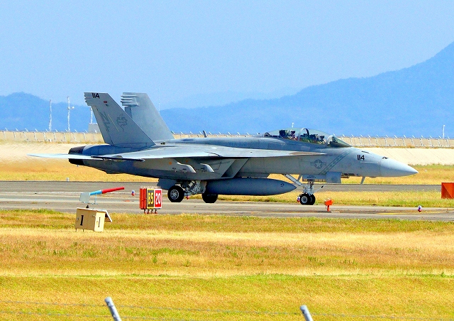 米海軍艦載機 F/A-18F スーパーホーネット 戦闘攻撃機(岩国基地)、NF、114番機が着陸 14時20分に離陸した機。1時間26分の飛行でした。 |