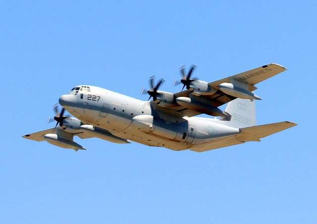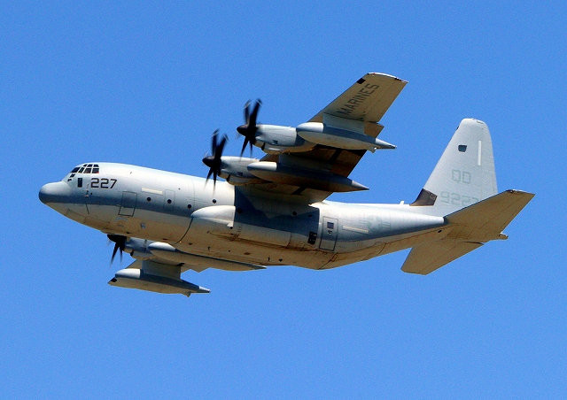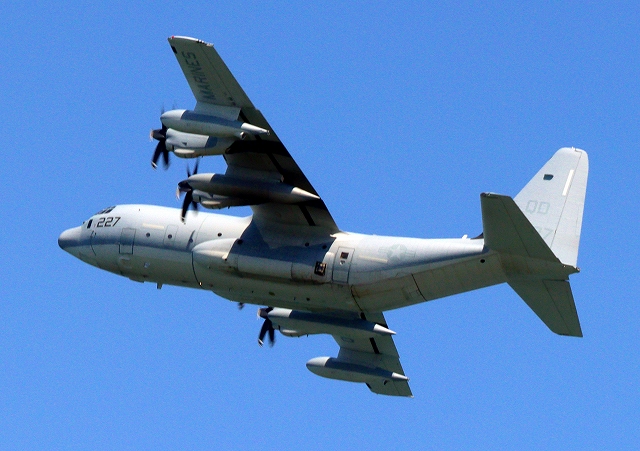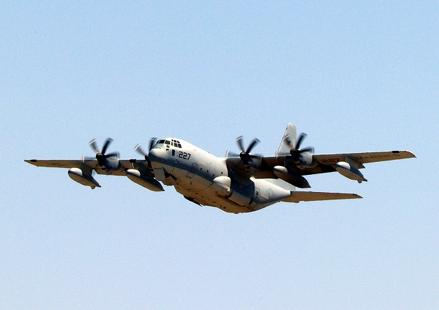 米海兵隊 KC-130J 空中給油機 スーパーハーキュリーズ(岩国基地)、QD 9227番機が離陸 |