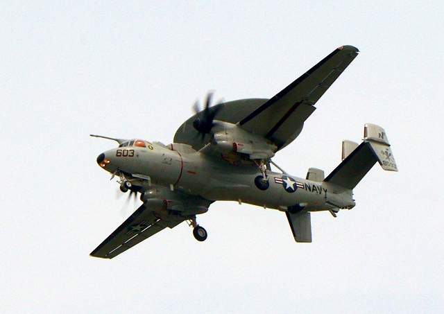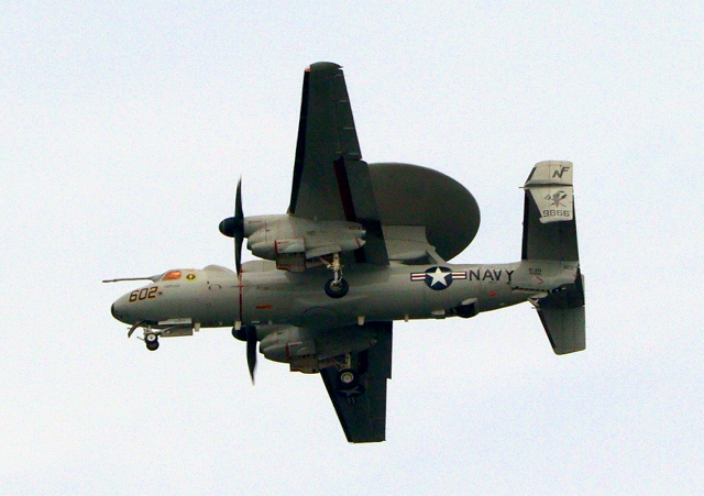 米海軍艦載機 E-2D アドヴァンスド・ホークアイ 早期警戒機(岩国基地)、602番機が離陸 |
