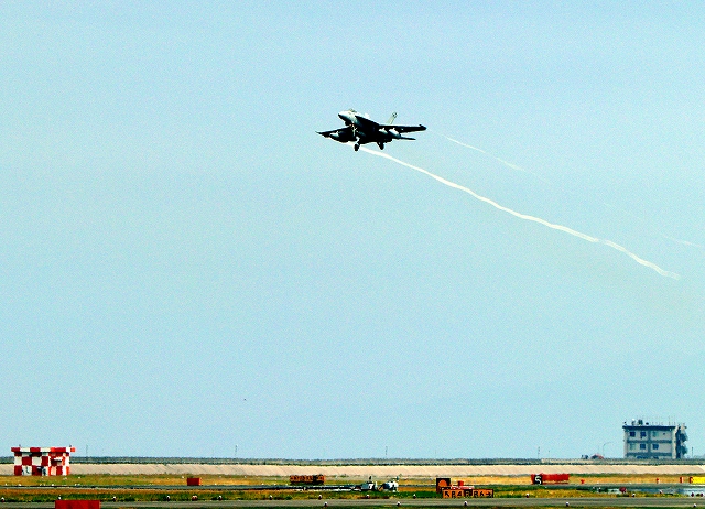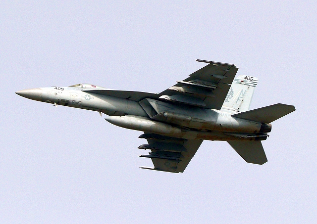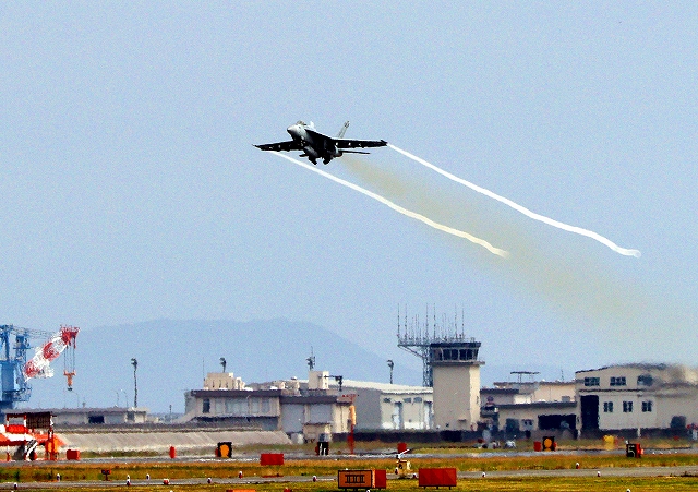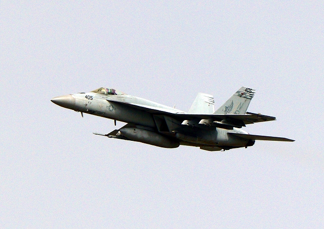 米海軍艦載機 F/A-18E スーパーホーネット 戦闘攻撃機(岩国基地)、NF、405番機が離陸 |