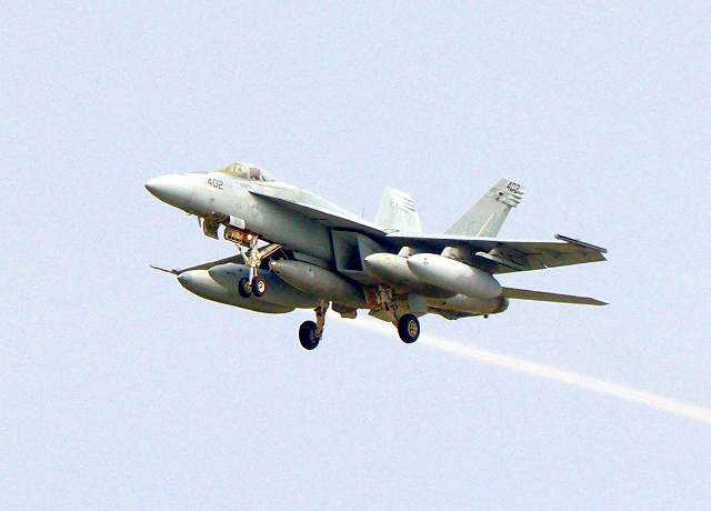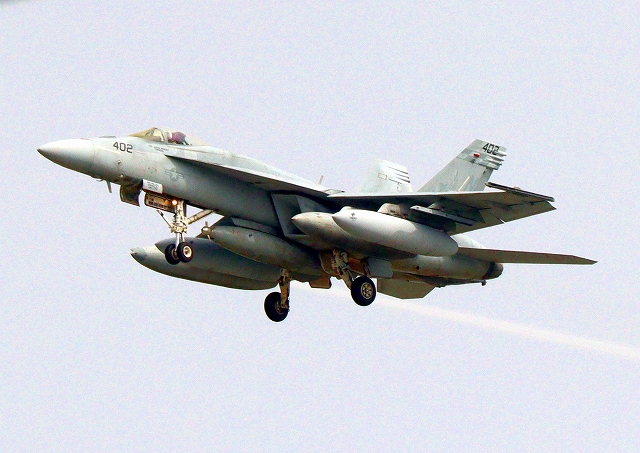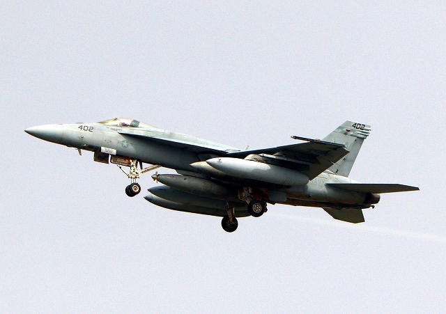 米海軍艦載機 F/A-18E スーパーホーネット 戦闘攻撃機(岩国基地)、NF、402番機が離陸 |