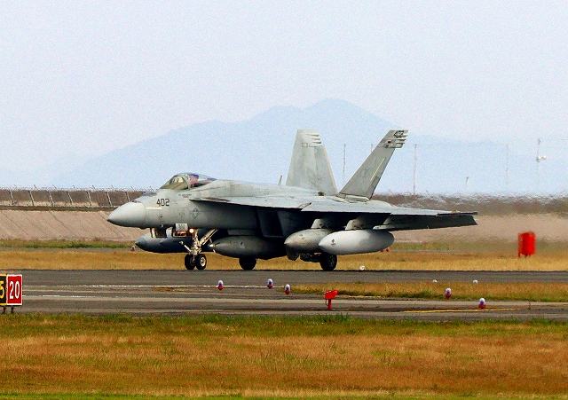 米海軍艦載機 F/A-18E スーパーホーネット 戦闘攻撃機(岩国基地)、NF、402番機が着陸 |