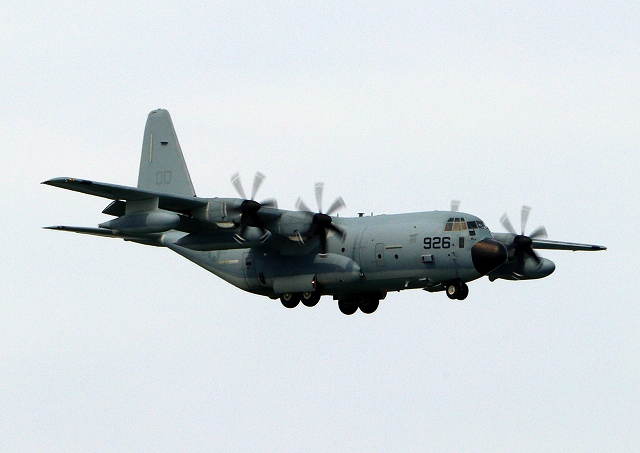 米海兵隊 KC-130J 空中給油機 スーパーハーキュリーズ(岩国基地)、QD 7926番機が着陸 |