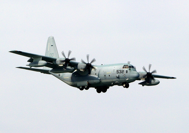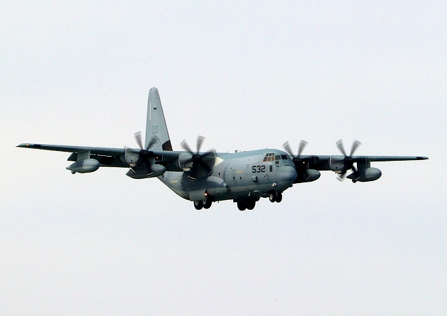 米海兵隊 KC-130J 空中給油機 スーパーハーキュリーズ(岩国基地)、QD 9532番機が着陸 |