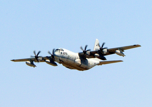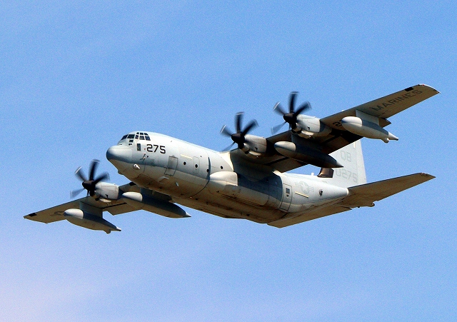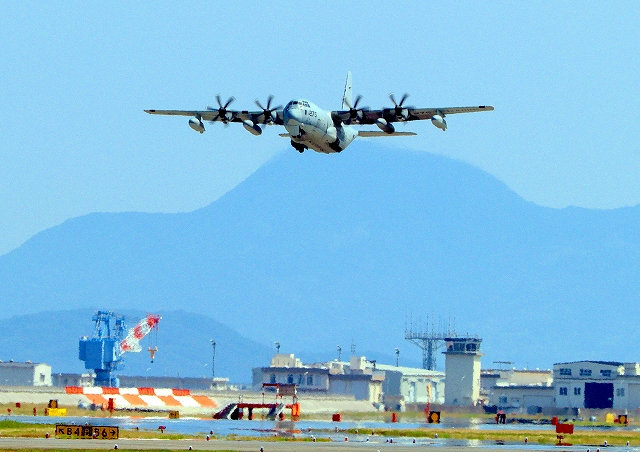 米海兵隊 KC-130J 空中給油機 スーパーハーキュリーズ(岩国基地)、QD 02755番機が離陸 |
