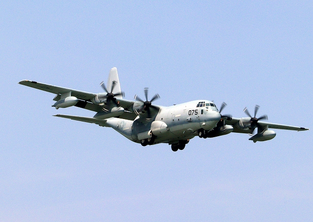 米海兵隊 KC-130J 空中給油機 スーパーハーキュリーズ(岩国基地)、QD 8075番機が着陸 |