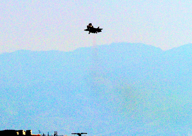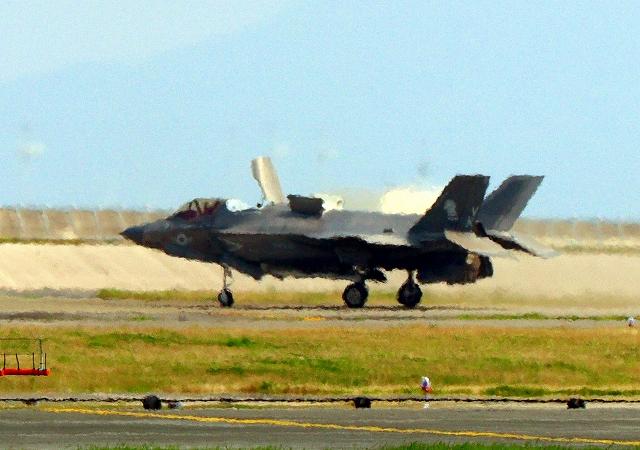 米海兵隊 F-35B ライトニングⅡ ステルス戦闘機(岩国基地)、VK、12.1番機が南の垂直着陸パッドの上でホバリング |