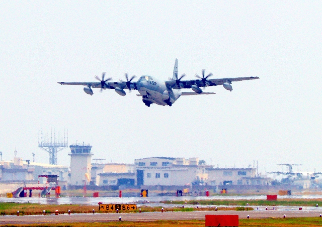 米海兵隊 KC-130J 空中給油機 スーパーハーキュリーズ(岩国基地)、QD 9532番機が離陸 |