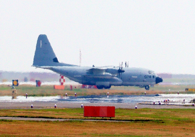 米海兵隊 KC-130J 空中給油機 スーパーハーキュリーズ(岩国基地)、QD 8074番機が着陸 |
