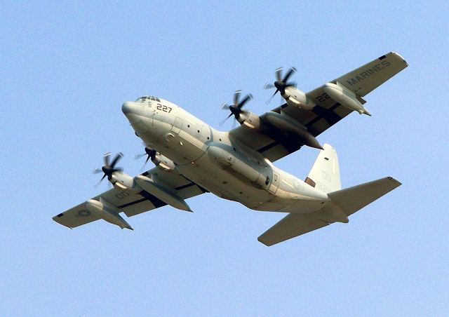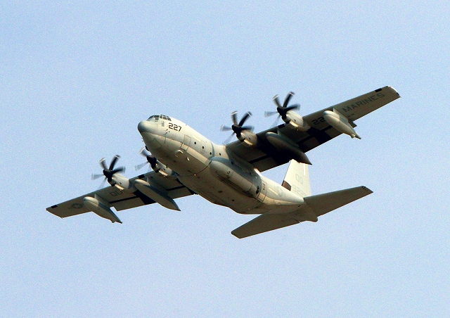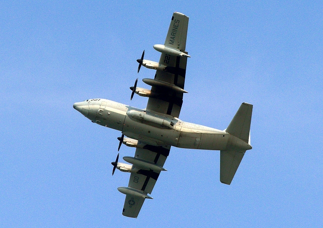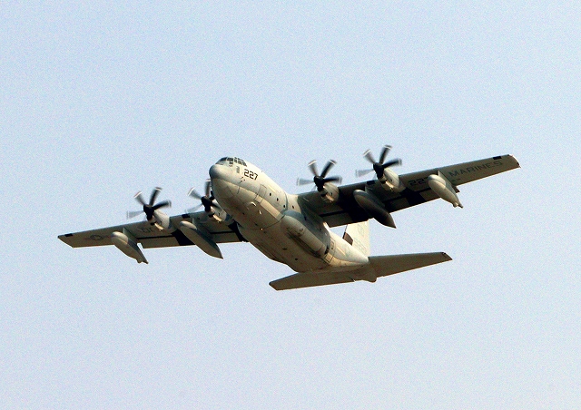 米海兵隊 KC-130J 空中給油機 スーパーハーキュリーズ(岩国基地)、QD 9227番機が離陸 |