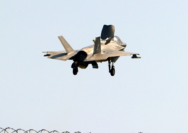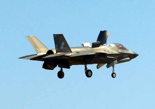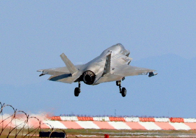 米海兵隊 F-35B ライトニングⅡ ステルス戦闘機(岩国基地)、VK、05番機が短距離着陸 |