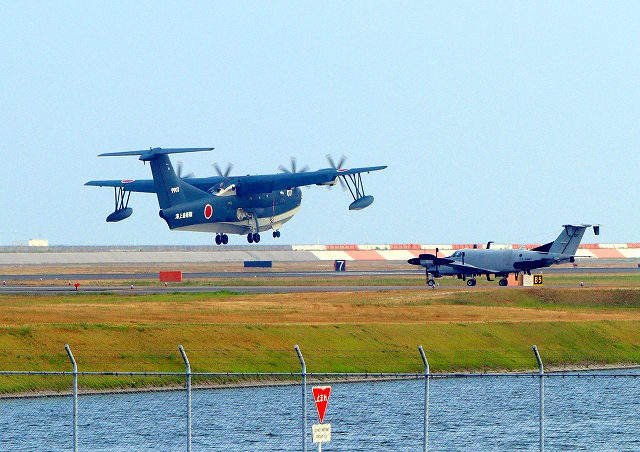 米陸軍 RC-12X 電子情報収集機 ガードレール(韓国内米軍基地)の前に海上自衛隊 US-2 救難飛行艇(岩国基地)、9907番機 |