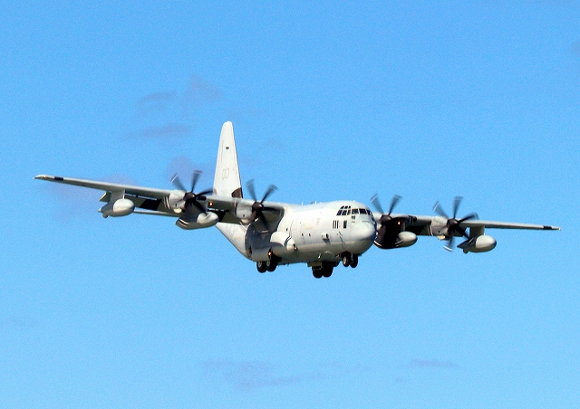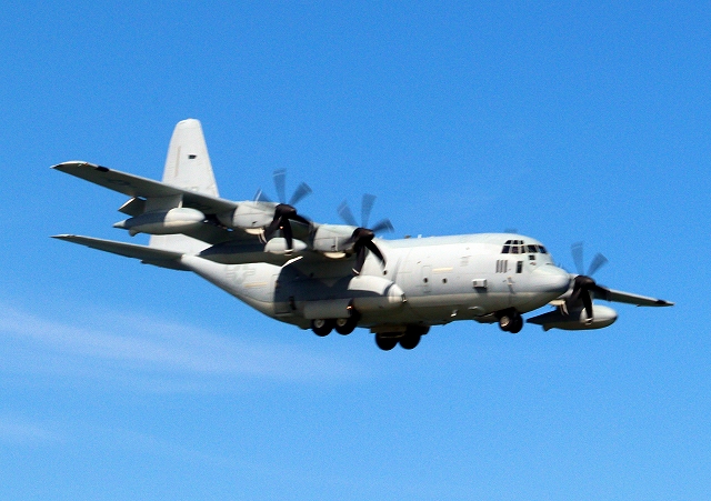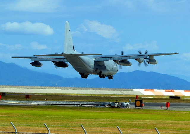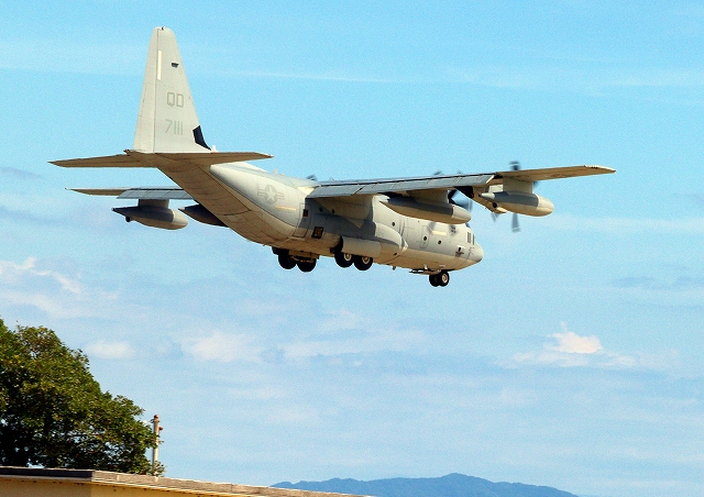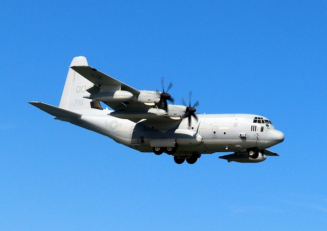 米海兵隊 KC-130J 空中給油機 スーパーハーキュリーズ(岩国基地)、QD 7111番機が着陸 |