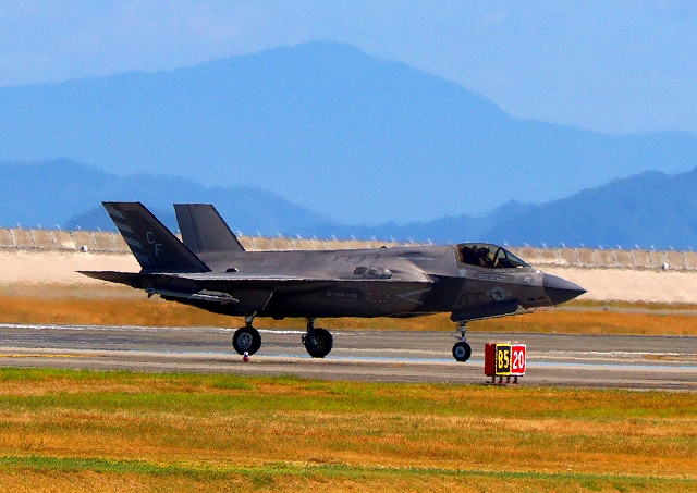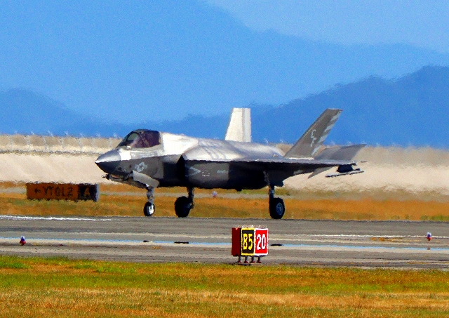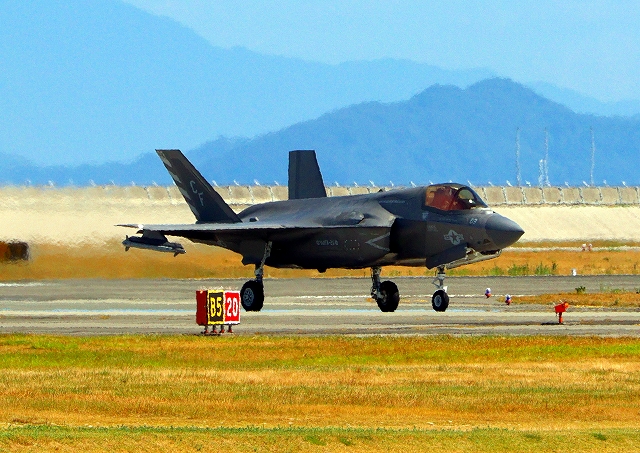 米海兵隊 F-35B ライトニングⅡ ステルス戦闘機(岩国基地)、CF、10番機が着陸 14時15分に離陸した機。49分間の飛行でした。 |