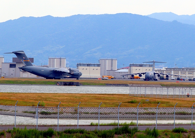 外来機駐機場に、米空軍 C-17A 大型ジェット輸送機 グローブマスターⅢ AMC-99208番機、88191番機 |