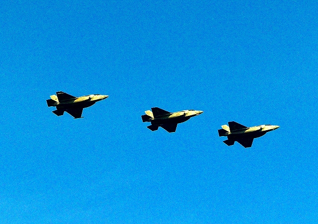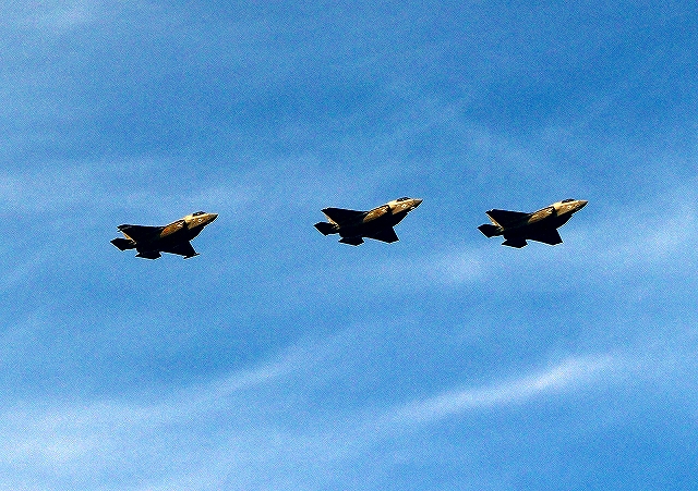 米海兵隊 F-35B ライトニングⅡ ステルス戦闘機(岩国基地)、DT、30番機、26番機、01番機が3機編隊で帰還 |