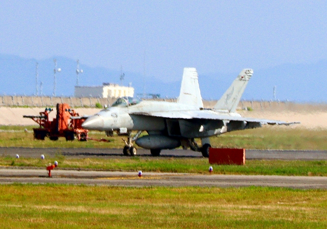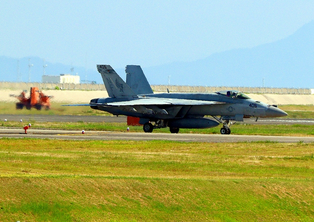 米海軍艦載機 F/A-18E スーパーホーネット 戦闘攻撃機(岩国基地)、NF、405番機が着陸 |