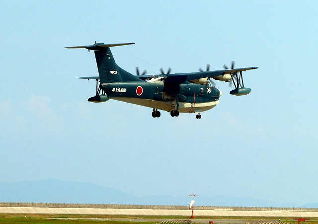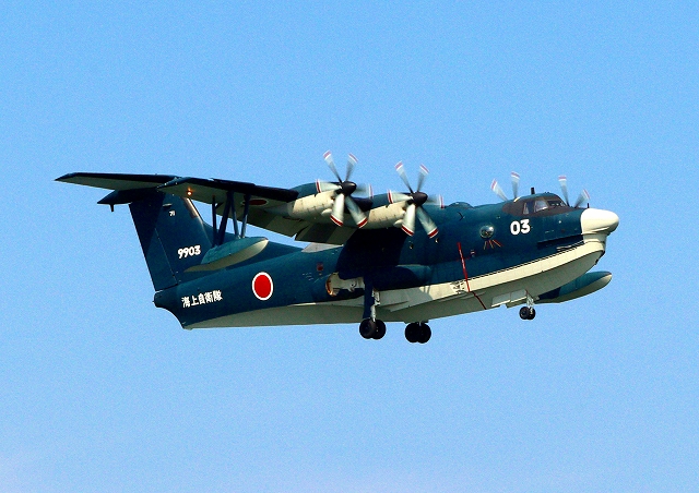 海上自衛隊 US-2 救難飛行艇(岩国基地)、9903番機がタッチアンド・ゴーして旋回 |