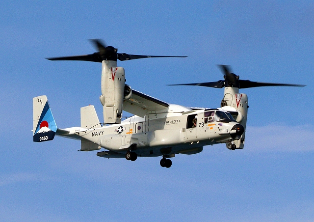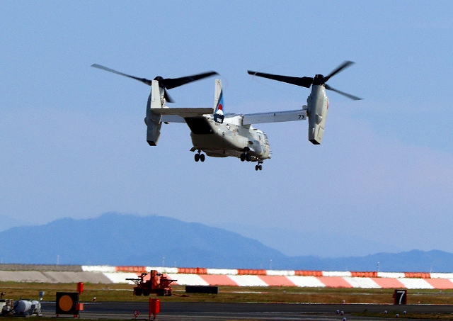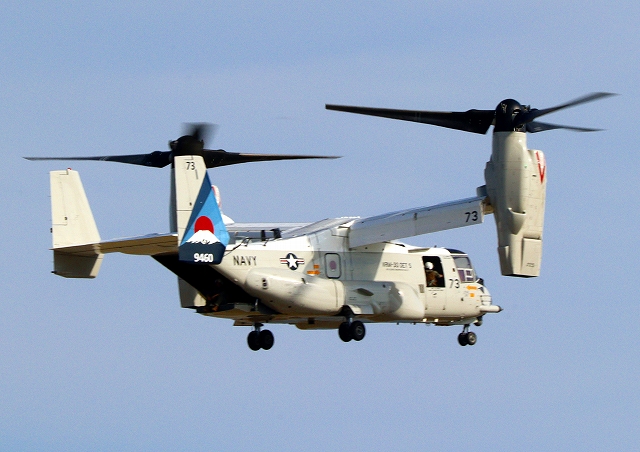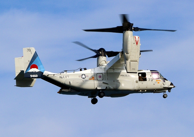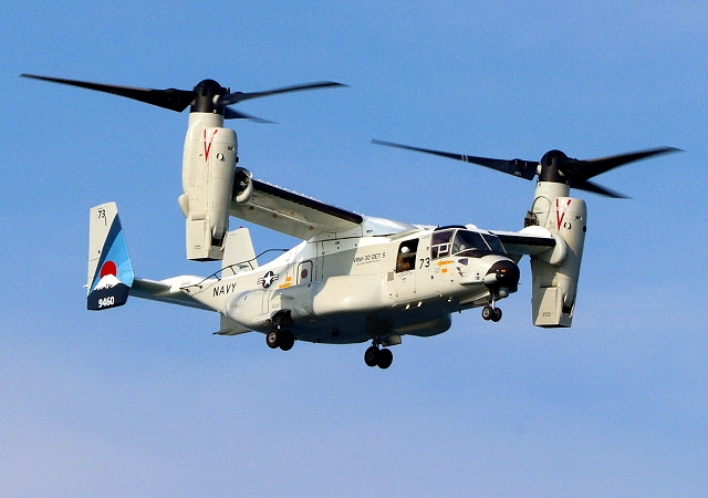米海軍艦載機 CMV-22B オスプレイ(岩国基地)、73-9460番機がヘリモードで、旋回 |
