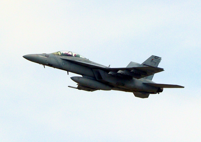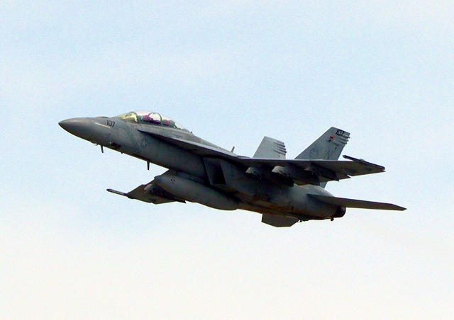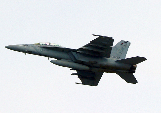 米海軍艦載機 F/A-18E スーパーホーネット 戦闘攻撃機(岩国基地)、NF、107番機が離陸 |