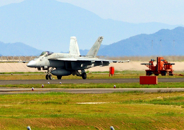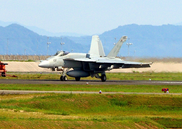 米海軍艦載機 F/A-18E スーパーホーネット 戦闘攻撃機(岩国基地)、NF、411番機が着艦 |