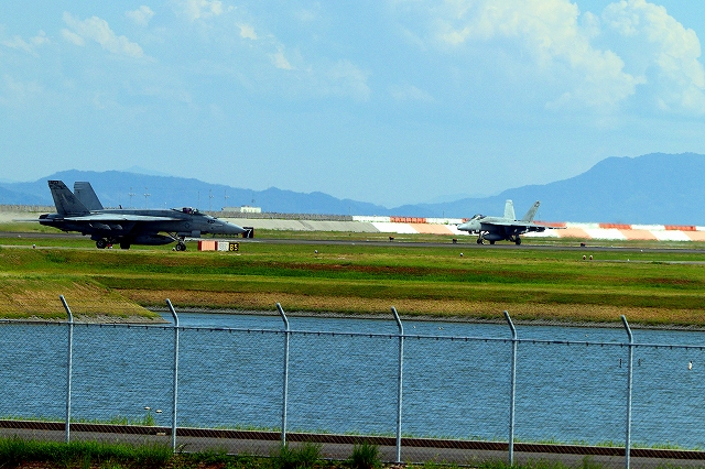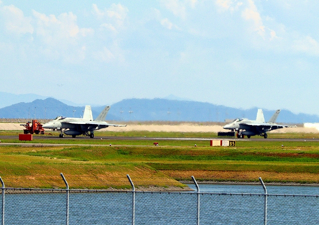 米海軍艦載機 F/A-18E スーパーホーネット 戦闘攻撃機(岩国基地)、NF、212番機、216番機が着艦 |