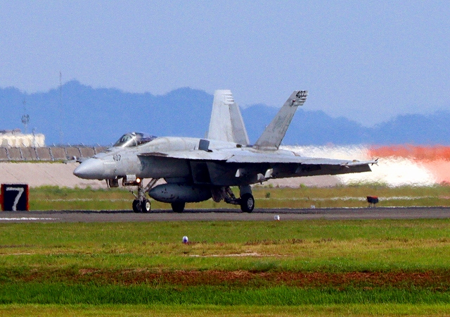 米海軍艦載機 F/A-18E スーパーホーネット 戦闘攻撃機(岩国基地)、NF、407番機が着艦 |