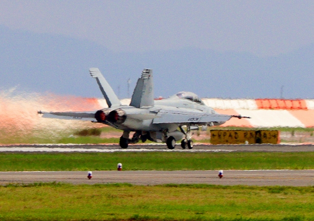 米海軍艦載機 F/A-18F スーパーホーネット 戦闘攻撃機(岩国基地)、NF、103番機が離陸 |