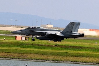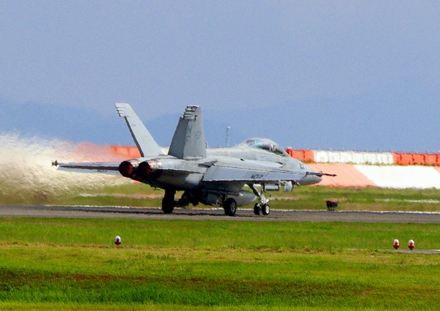 米海軍艦載機 F/A-18F スーパーホーネット 戦闘攻撃機(岩国基地)、NF、106番機が離陸 |