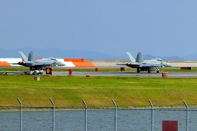 米海軍艦載機 F/A-18F スーパーホーネット 戦闘攻撃機(岩国基地)、NF、107番機が離陸 |