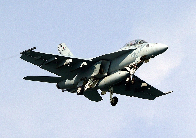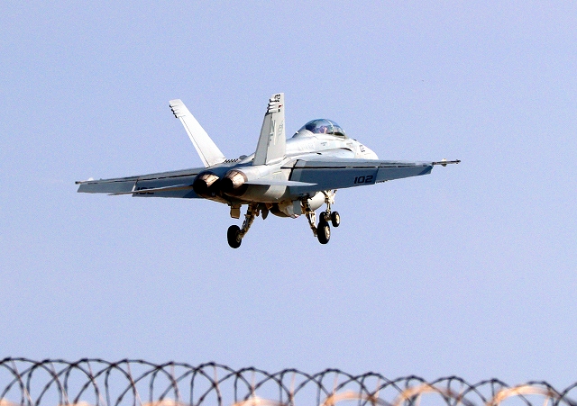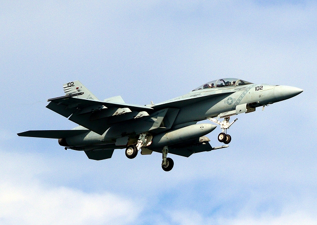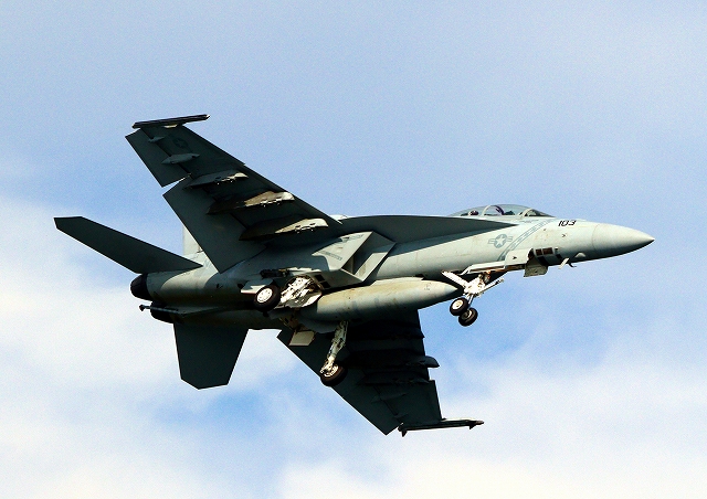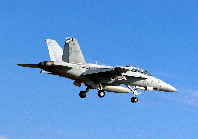 米海軍艦載機 F/A-18F スーパーホーネット 戦闘攻撃機(岩国基地)、NF、103番機が帰還 |