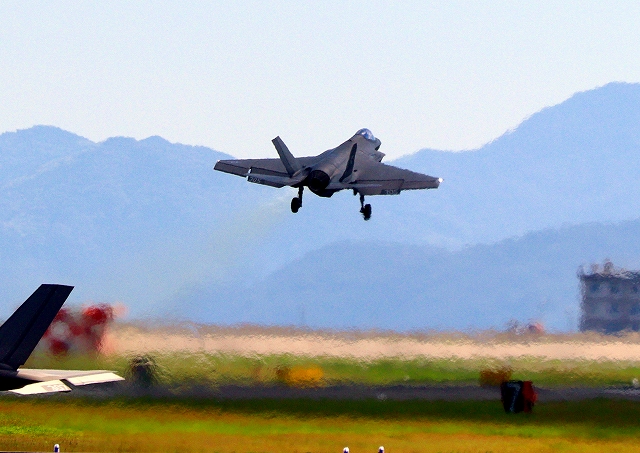 米海軍艦載機 F-35C ライトニングⅡ ステルス戦闘機(岩国基地)、NF、305番機がタッチアンド・ゴーして旋回(5周目) |