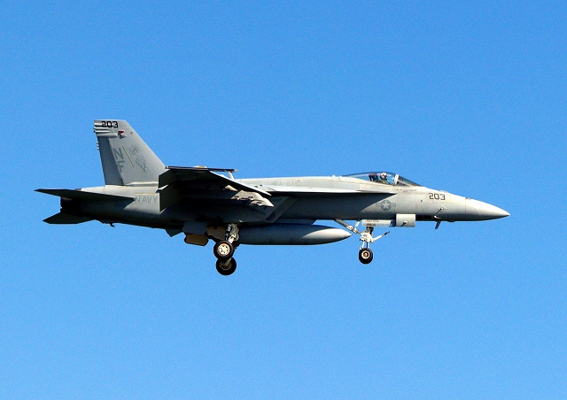 米海軍艦載機 F/A-18E スーパーホーネット 戦闘攻撃機(岩国基地)、NF、203番機が旋回(2周目) |