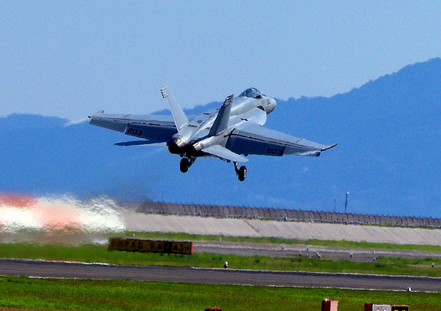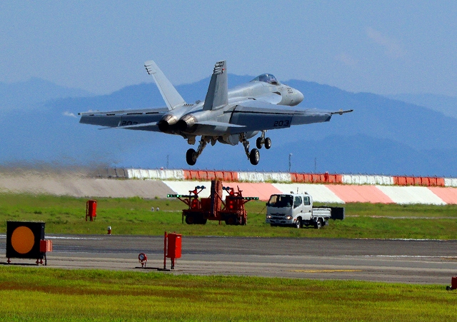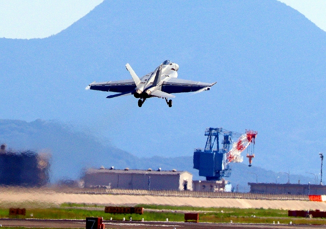 米海軍艦載機 F/A-18E スーパーホーネット 戦闘攻撃機(岩国基地)、NF、203番機がタッチアンド・ゴーして旋回(2周目) |