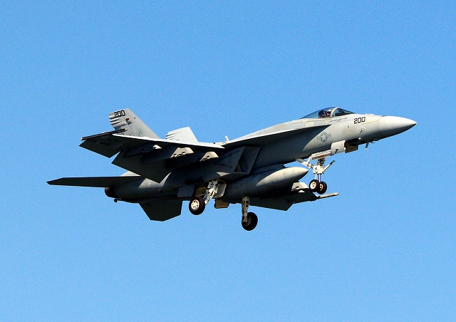 米海軍艦載機 F/A-18E スーパーホーネット 戦闘攻撃機(岩国基地)、NF、200番機が旋回(1周目) |