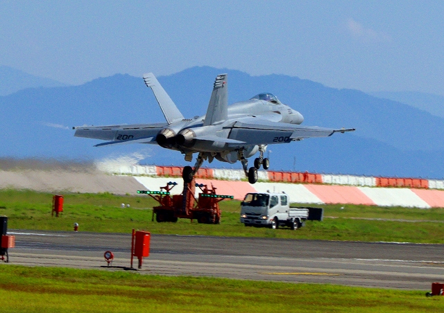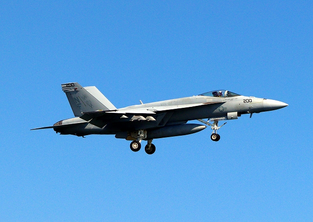 米海軍艦載機 F/A-18E スーパーホーネット 戦闘攻撃機(岩国基地)、NF、200番機がタッチアンド・ゴーして旋回(1周目) |