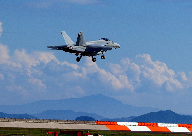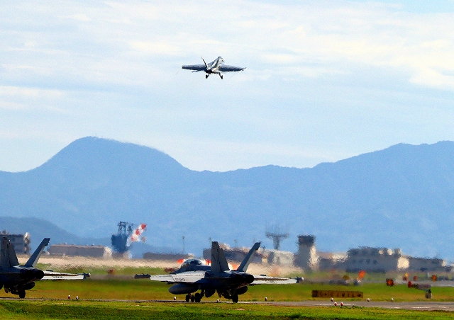 米海軍艦載機 F/A-18E スーパーホーネット 戦闘攻撃機(岩国基地)、NF、203番機がタッチアンド・ゴーして旋回(5周目) |