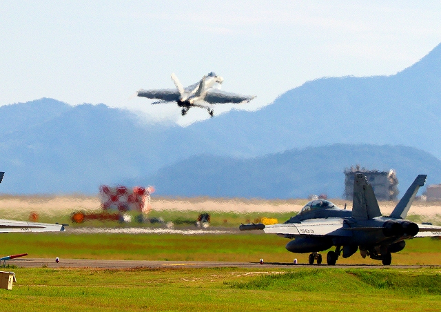 米海軍艦載機 F/A-18E スーパーホーネット 戦闘攻撃機(岩国基地)、NF、203番機がタッチアンド・ゴーして旋回(7周目) |