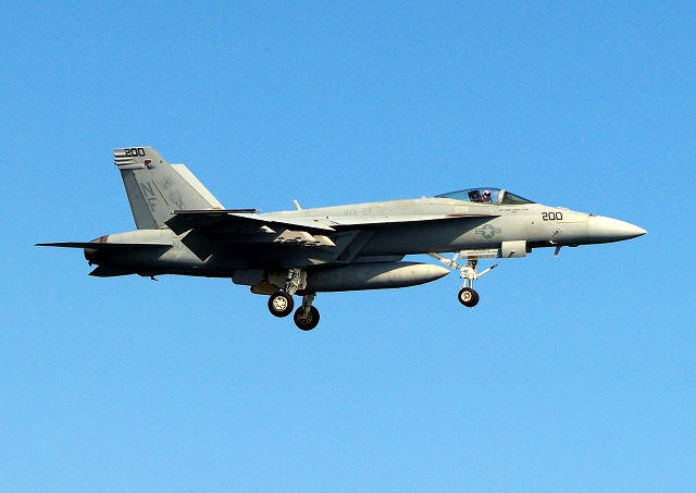 米海軍艦載機 F/A-18E スーパーホーネット 戦闘攻撃機(岩国基地)、NF、200番機が旋回(5周目) |