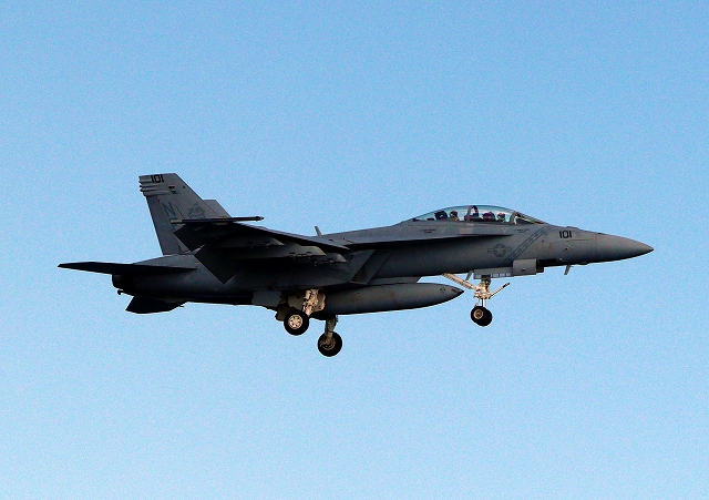 米海軍艦載機 F/A-18F スーパーホーネット 戦闘攻撃機(岩国基地)、NF、101番機が旋回(1周目) |