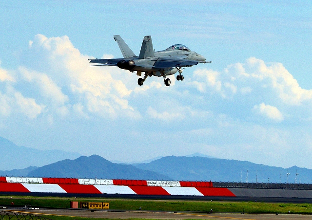 米海軍艦載機 F/A-18F スーパーホーネット 戦闘攻撃機(岩国基地)、NF、101番機がタッチアンド・ゴーして旋回(1周目) |