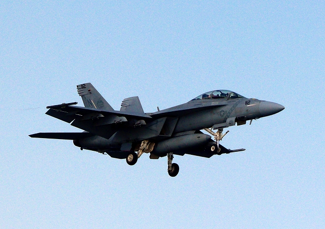 米海軍艦載機 F/A-18F スーパーホーネット 戦闘攻撃機(岩国基地)、NF、112番機が旋回(3周目) |