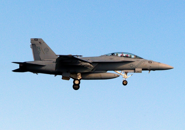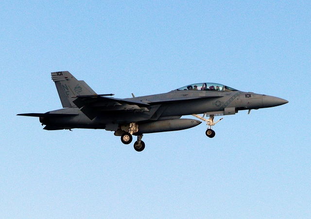 米海軍艦載機 F/A-18F スーパーホーネット 戦闘攻撃機(岩国基地)、NF、101番機が旋回(5周目) |